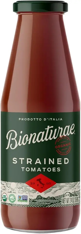 24 fl oz organic strained tomatoes – smooth, seedless puree from vine-ripened tomatoes. Pure flavor for sauces, soups, or recipes. Organic and natural – essential base for homemade Italian cooking.